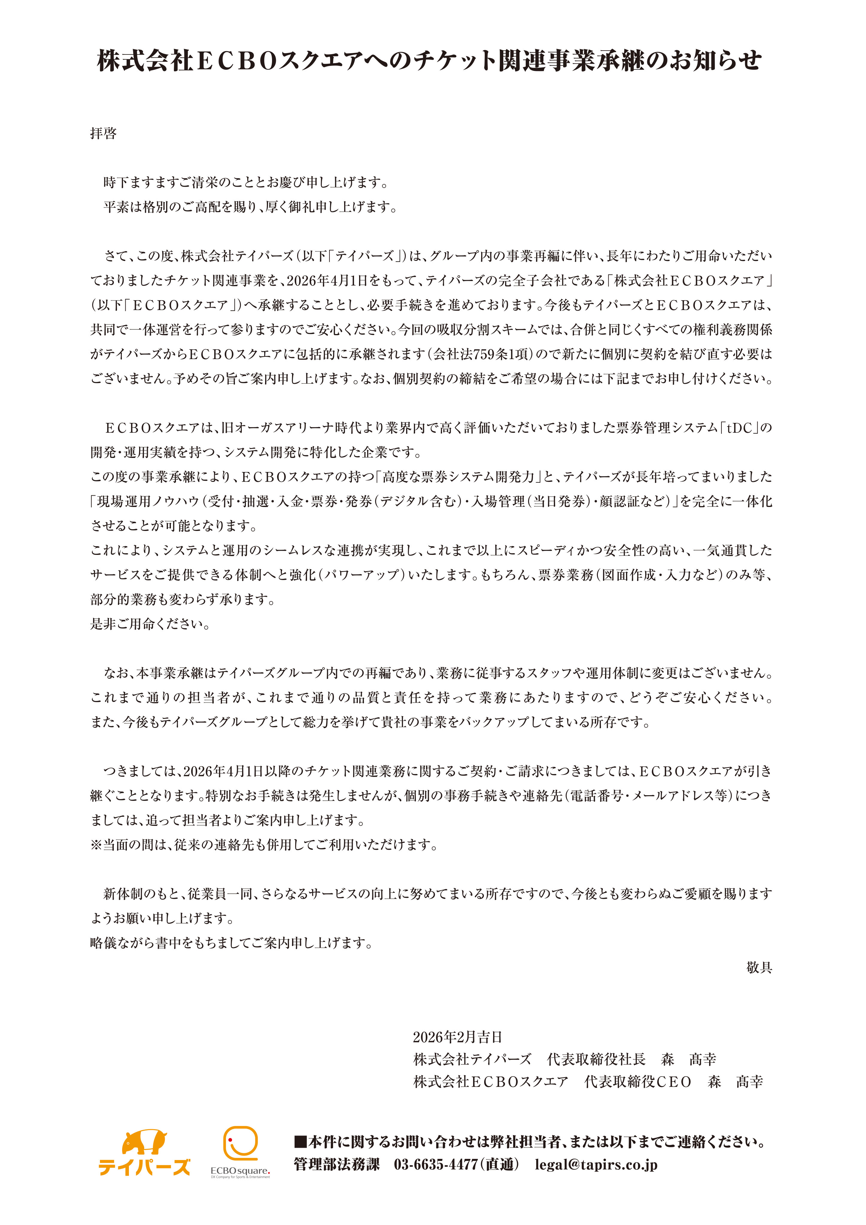 株式会社ECBOスクエアへのチケット関連事業承継のお知らせ